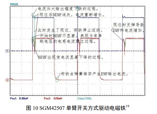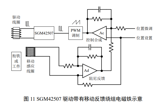 驱动电磁铁/电磁阀时,一般由于绕组电阻偏大、行程小,真正利用电流、电压脱出的机会不多(除非使用高速强力大行程电磁铁)。图 10 的波形显示了一个衔铁弹簧自复位电磁铁在衔铁加速、限位和复位时的波形,可识别到限位撞击的复位行程发电。这些信号可为控制系统操作电磁铁/电磁阀提供状态参考依据20,这种简单控制可用于一些要求不是很高的应用中,如红外滤光片翻板等。如需控制加速、减速、急停和抖动吸收则需要利用外部电路快速控制 SGM42507 开关实现,利用飞轮状态方便监测复位过程。SGM42507 响应速度快,可满足大多电磁铁/电磁阀驱动波形合成需要。双臂 PWM 方式可用于悬浮指针等任意定位应用。参考图 11,借助其高速响应能力和移动反馈,它也可以用于开关驱动风门、光圈调节场合21。