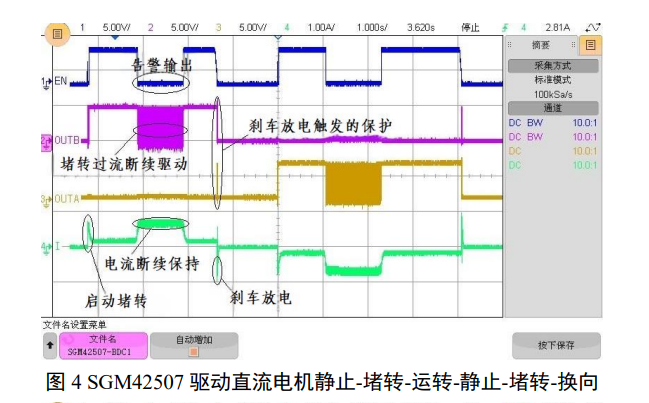 驱动直流电机一般需要完成起止、调速和换向几个动作。调速包括 PWM 调压调速和加速-飞轮(滑行)的调速方式。如果有换向绕组,可利用转换驱动方向来实现不同方向的驱动。对于利用预置扭矩方式确定旋向的电机,则无法利用驱动电路换向。不定向电机因停止时的阻力残留,往往导致每次启动方向不一致,可以利用再次启动换向。对启动的改善包括启动时输出较高电压,以及在启动堵转时利用暂停驱动产生顿挫减少静摩擦。SGM42507 的抗堵转设计在输出电流达到脱出门限或电压低于脱出门限时转入下管或上管同时导通的续流状态、维持扭矩,并在过流、欠压恢复后继续驱动。