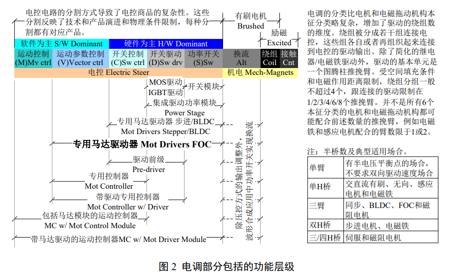 所有这些装置都有配合的电调部分,至少有配合的接触器和断路器。如果把励磁驱动和换向这 些专门的电调剥离,也不考虑功率开关及其驱动器的种类,则电调部分可从其包括的功能层级和所管理的通道数 2 个维度分类。除了最简单的衔铁驱动可以使用半个开关臂外,电调部分总是成对地把开关接成推挽图腾柱使用。常见通道数是 1、2、3、4、6、8 通道,或 0.5H、1H、1.5H、2H、3H、 4H,其中 H 指 H 型桥接。图 2 给出了这些功能层级以及一个电调电路模块所包括的组合情况。其中,电控都完整地包括从运动控制到功率开关的所有层级,差异只在于其复杂性和如何分割。