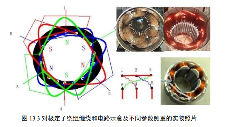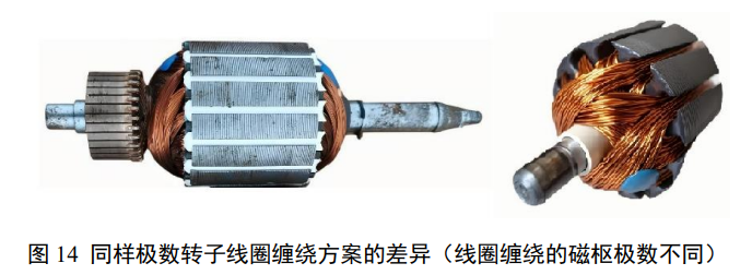 图 13 是大功率 3 对极定子绕组连线示意、2 个绕组照片和一个对照的小功率 3 对极定子绕组照片。显然无论是哪个产品绕组之间都存在严重耦合。进一步参考图 14,可见同样极数的产品的缠绕方案存在很大差异。这些方案在相同的空间里铜铁填充的比例不同,反映了对特性要求的不同,如对速度、出力、定位能力和效率的不同要求。