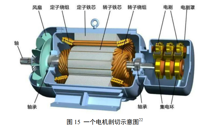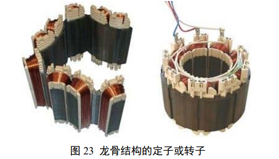 大量电机商品种类对应特定应用需求,是配合电调满足特定参数要求、对铜铁利用、空间利用追求的、堪称艺术品的专门设计。图 21 是一个典型的三相交流电机的结构,用来与图 22、图 23、 图 24 不同结构优化的电机作对照。