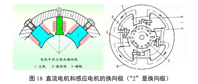 图 18 示意的两种换向绕组磁极布置与电机分类的一个维度有关,即主动磁极(磁枢)和被动磁极(磁轭)是否对偶有关。从图 18 所示的布置看,一部分空间被用于形成换向电极,降低了铜铁对空间的填充,从而降低了铜铁利用率。换向极导致主动磁极和被动磁极空间位置不对偶,从而可以有明确的初始拖动方向。为了改善这种给每个极增加伴随的绕组或者对每个极切槽的利用率损失,发展出了利用极数不匹配产生等效的不对偶的磁极布置方式,取代了这种专用的换向极的布置方案。