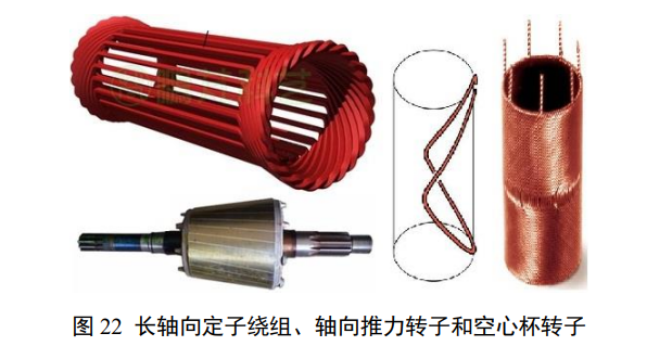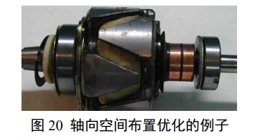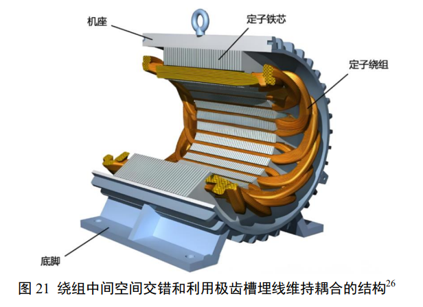 如果不考虑如图 20 所示沿轴向做空间布置优化的情况,以及对转速、扭矩、扭矩均匀性、角度控制的单个或者若干个特性的优化,以空间和材料特性利用率看,图 19 中间的三相绕组和磁极布置是最优化的。磁通时间变化和空间变化呼应、有明确旋向,出力连续、应力波动小。铜铁空间占比互补、方便调整,缠绕简单、方便轴向延伸。