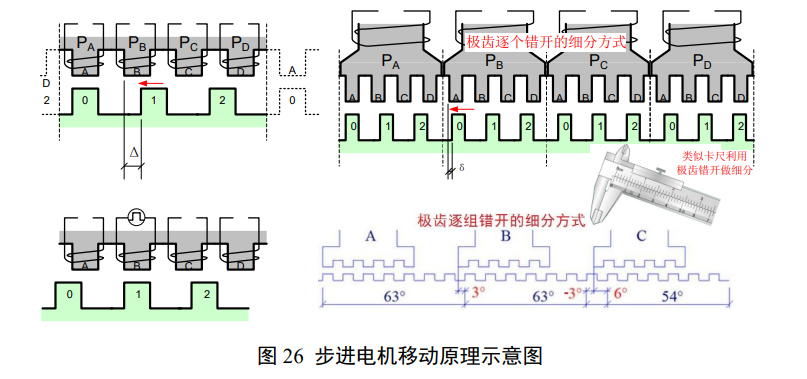 图 26 的左半部分是将图 25 中左侧的 3 对-4 对极沿周长展开成平面,并只保留 3 极-4 极的简化图,用来解释脉冲激励的传统步进电机的工作过程。图 26 左上图中极 A 和极 0 对准,磁路短、磁阻低。如果要使转子沿图中箭头方向移动、到达左下图所示的下一个嵌顿位置,则需要加大对线圈PB的激励。该激励需要克服把 A 和 0 拉开的阻力,才能使 B 和 1 对准,完成一次步进。