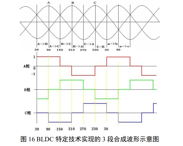 BLDCM 即直流无刷电机,指一个采用特定技术实现的产品,即利用电子开关分段合成 3 相波驱动的电机产品。直流无刷电机内部一定包括一个电子开关。其合成的波形从一开始的 3 段24合成(120°25,也叫做 6 步驱动)到 5 段合成(150°)和 2 段(180°,6 步,利用 PWM 合成),再到直接合成正弦波。3 段合成的三相波形和正弦波波形的对照可见图 16。