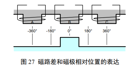 图 26 中的磁路差仅仅是由极齿的些许错开导致的;为了突出这种磁路差,图 27 用 3 极对 1 极表达了这种磁路差,并把 2 个嵌顿位置之间的距离记做一个 360°循环。图 28 表达了在这个循环内磁场储能和约束力的变化,以及如何利用连续地配置驱动电流比例、改变合成的磁极产生拖动。