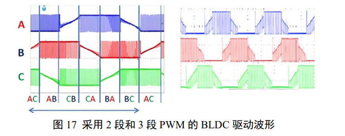 BLDC 技术又进一步发展了采用 PWM 控制驱动电压的方案,采用 PWM 调压的 2 段合成波形见图 17 左侧,3 段合成波形见图 17 右侧。采用方波或阶梯波驱动与正弦波驱动阶梯处的电流谐波导致了不必要的励磁强度,降低了铁芯能力的利用和加大了电调系统应力。与直流无刷电机互补的是交流有刷电机,为取消直流电机的电刷而开发的 BLDC 电控同样可以用于交流有刷电机,BLDC中的 DC 反映了其演进过程,不是其适应场合的限制。
