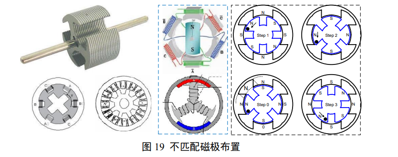 图 19 显示了多种不匹配磁极布置的情况,包括非成对极数的 3 极转子、1 对极-3 对极配置、2 对极-3 对极配置、4 对极-6 对极配置和 3 对极-1 对极配置;右侧 4 幅图是利用启动时改变绕组驱动顺序,制造不匹配、定向启动的情况(黑色虚线框所示)。
