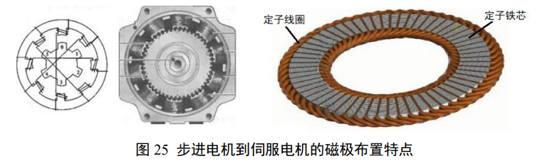 步进电机、伺服电机和定位电磁铁从结构上讲都是漏磁的,即通过改变漏磁情况(磁阻)实现动作。步进电机利用磁阻差做角度位置约束,每次步进都是突破一次嵌顿。无论是动态的还是静态的,任何电机都是依靠磁阻差实现旋转动作和会表现出嵌顿的,但只有传统的步进电机需要强化和利用嵌顿保持位置和实现按步移动,而其它电机则尽量减少嵌顿和保持连续移动。做细分驱动的步进电机则是反步进电机传统的努力方向。它利用控制相电流的比例控制合成磁极的位置,使等效的嵌顿位置可以在由铁芯(或线圈)形成的嵌顿位置间偏离,提高定位分辨率,利用电流大小控制嵌顿的约束力。图 25 是可当成步进电机使用的漏磁电机(左侧)、利用凸齿的步进电机(中间)和可作为伺服电机使用的盘式电机(右侧)结构的示意,配合后续部分说明工作原理及其结构优势。