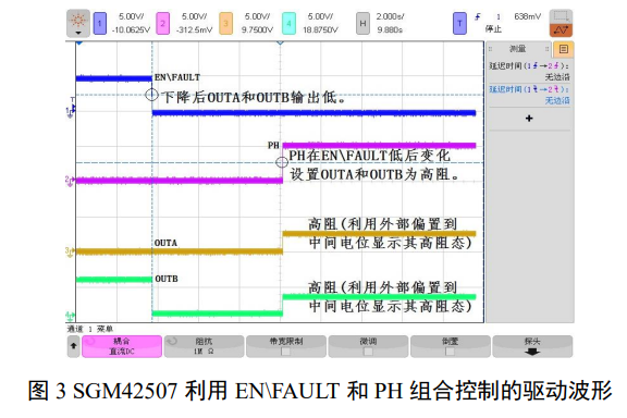 ENFAULT 被拉低后变化 PH 输入使 A 和 B 的输出变化到新的方向,保持至驱动电流维持期间;驱动电流回 0 后 A 和 B 转入高阻并维持在高阻态。 |