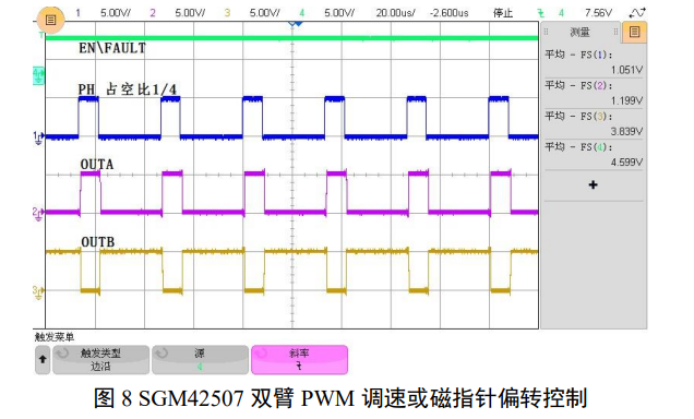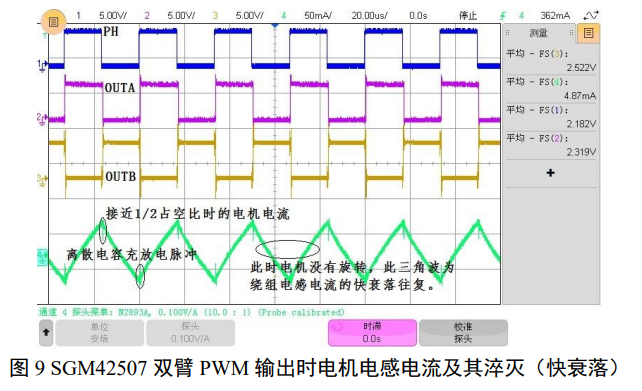 双臂 PWM 输出的波形见图 8。双臂 PWM 输出对速度调节较快,同时可实现旋向转换、用于双向调速和磁指针角度控制。双臂输出在 1/2 占空比时电机停转,电感平均电流为零。这时电感电流往复如图 9 所示18,电感电流以快衰落往复。双臂 PWM 对阻性负载驱动无调节能力。