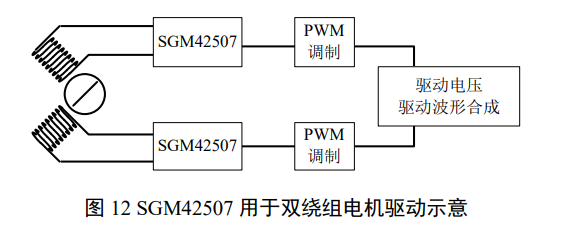 SGM42507 是一个完整的 H 桥,可用多个 SGM42507 来组成多绕组电机的绕组驱动。步进电机、磁阻电机、同步电机、异步电机的电调电路都包括位置或/和扭矩测量以及 PWM 或 SPWM 脉冲序列生成。参考图 12,SGM42507 可以配合电调部分实现驱动和驱动保护。