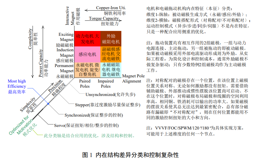 除了少数相互作用的对侧都主动出力的情况,所有拖动装置都有一个主动侧和一个被动侧。以 被动侧的磁场如何产生作为 1 个维度,以主动侧磁枢(不一定有铁芯,如空心杯绕组)和被动侧磁极(磁轭)完全相对与否作为第 2 维度,可以把包括磁铁在内的所有电磁拖动装置分类成图 1 所示的 6 种组合。图 1 中的第 3 维度与这种分类无关,是这些分类都可能有的工作模式或优化方向。