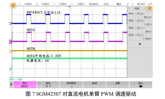 可以利用单臂 PWM 输出变化有效输出电压的方式实现电机调速,有关波形见图 7。如需要变化 旋向则可通过调换 PWM 输出臂实现。这种方式电感电流处于慢衰减模式,电机以涡流方式减速, 比采用双臂 PWM 方式减速慢,但功耗低。如果配合对 PH 的延迟驱动,则在 2 个 PWM 输出之间电 机转入飞轮运行,可进一步降低功耗,这时驱动电路没有任何刹车作用。除了用于电机等感性负载, 单臂 PWM 也可用于对阻性负载驱动的功率调节。