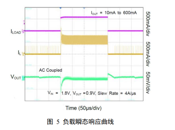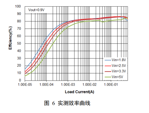 图 5 展示了SGM61006在1.8V输入电压、0.9V 输出电压条件下10mA至 600mA的负载瞬态响应。图 6 展示了SGM61006在不同输入电压、0.9V 输出电压条件下的效率曲线。测试条件为:TA = +25℃,COUT = 22μF,L = 0.47μH。