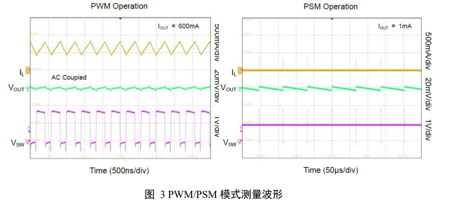 图3 展示了 SGM61006 在 PWM 模式和 PSM 模式稳态工作时的电流电压波形。测试条件为: TA=+25℃,VIN=1.8V,VOUT=0.9V,COUT=22μF,L=0.47μH。