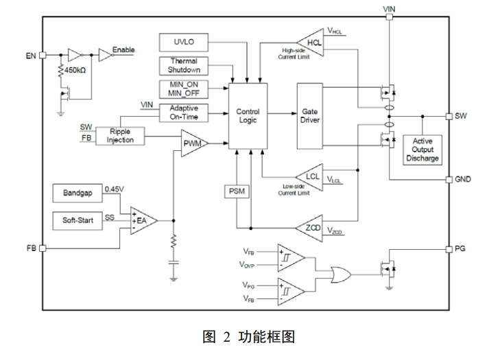 图 2 展示了使用 AHP-COT 结构的 SGM61006 降压转换器的功能框图。