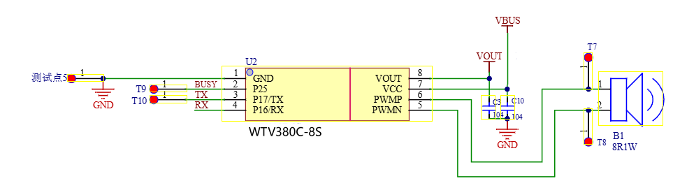 而WTV380C只需要通过简单的UART串口接口与主控MCU通信,外围仅需两个电容就能正常工作。这种设计直接降低了BOM成本,节省了超过60%的PCB面积,让原本捉襟见肘的结构设计一下子宽裕起来。