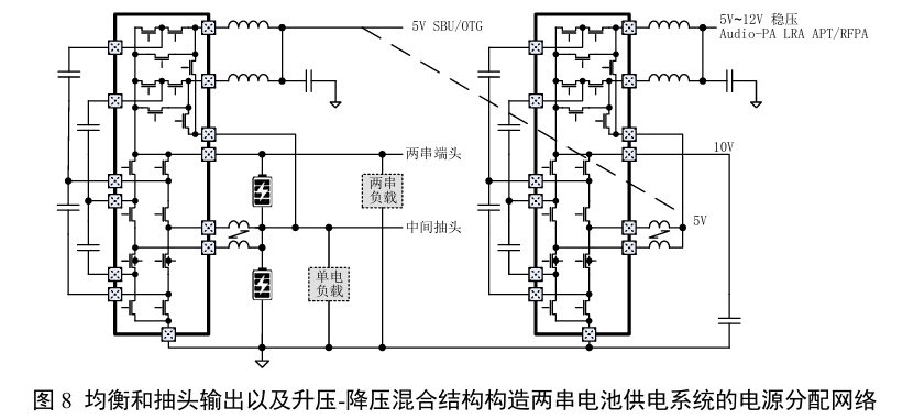 图8电路方案是面向手机和平板应用提出的电源分配网络。这个方案采用同一电路支持两串电池中间抽头供电,利用升压-降压过程将能量转移不连续的电感升压稳压转换成能量转移连续的电感降压稳压,可以减少应力和提高工作频率,以便采用更小元件实现高功率密度。其均衡能力允许采用不同容量电池串联,利用中间抽头为单电池电压范围工作的电路供电。USB作为这类应用的标准接口,5V是必须有的电源。10V~12V则是振动马达驱动、音频功放驱动和天地通需要的供电电压范围。