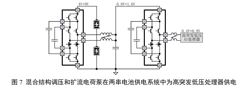 图7电路套接了混合降压和后固比扩流调理电荷泵(同一电路,工作模式差异),设计为高突发低压的AI处理器供电。后固比调理降低了PCB横向输送电流,允许稳压电路适当拉远安装。稳压电路根据输入电压范围以三种方式工作,即电荷泵半电压开关斩波工作、三段工作和飞电容短路全电压斩波工作,或者配合谐振电荷泵模式以半电压斩波或全电压斩波工作。图中表达了必要时采用电压模式耦合电感以加快对负载瞬变的响应速度。电压模式耦合电感在轻载时需要转入单相工作,且在负载进一步减小时阻止产生电感反向电流,以维持高转换效率。电压耦合使得停止工作相的开关节点出现负电压。