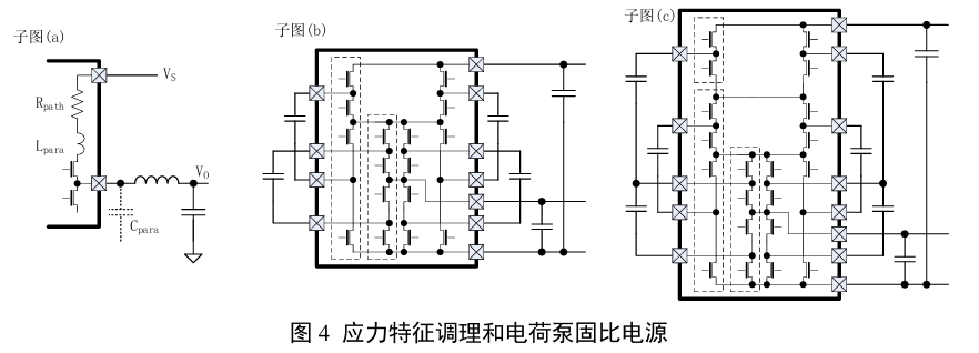 图4用来说明固比电荷泵的结构,以及其如何改善了与之配合的电感开关稳压电路的应力条件和减小了寄生电容的影响;从简洁表达出发,其中的两个电荷泵电路未考虑谐振工作。
