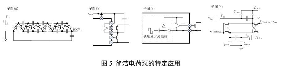 图4子图(c)所示电荷泵在高位套接了一个低压工作的电荷泵,即新增的虚线框圈起的部分, 获得了 5:1 倍率;这个结构中高位部分和低压部分工作在五分之一电压,套接在中间的部分工作在 五分之二电压。