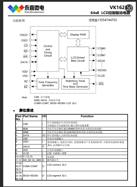 VK1625是一个点阵式存储映射的LCD驱动器,可支持最大512点(64EGx8COM)的LCD屏。