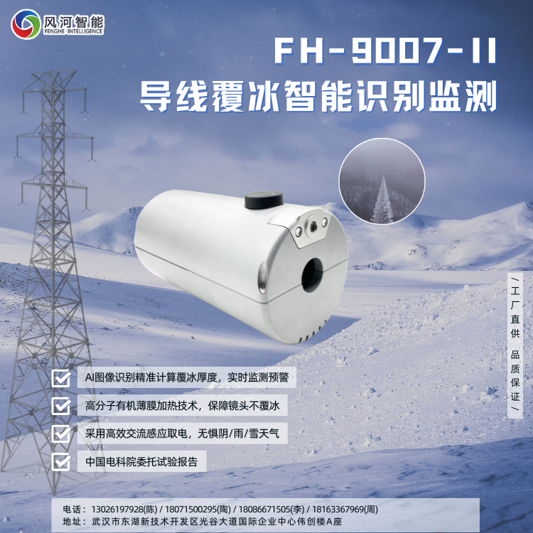 FH-9007-II输电线路观冰精灵是武汉风河智能科技有限公司自主研发的,通过采集现场视频图像来监测架空线路覆冰状况,引入数字图像处理技术,实现对输电线路覆冰的自动分析,并通过4G网络传送给远程监控中心,通过不断优化和提升自身的处理精度和再现性,可以快速准确的实现线路覆冰的判断。