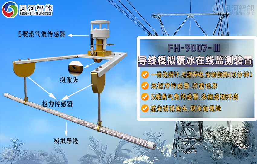 武汉风河智能科技自主研发生产的模拟导线覆冰监测装置,其思路是在线路杆塔上悬挂一根与线路导线同型号、同材质的模拟导线,以产生与线路相同气象条件下的覆冰情况,并通过测量模拟导线重量的变化来确定覆冰的厚度,从而等同推测输电线路导线的综合荷载和覆冰厚度,该方法算法简单、安装简单安全,不涉及线路带电安装,能方便准确的实现对输电线路导线覆冰的实时监测,可满足电路部门输电线路覆冰预警的要求。