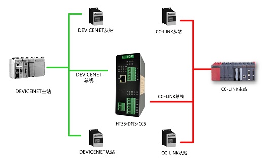 HT3S-DNS-CCS 是一款 CC-LINK 从站功能的通讯网关。该产品主要功能是将DEVICENET 接入到 CC-LINK 网络中。本网关连接到 CC-LINK 总线中作为从站使用,连接到 DEVICENET总线中作为从站使用。即可以实现DEVICENET接口仪表、变频器、综保、软启动器或施耐德PLC等设备接入到三菱的CC-LINK 网络系统。