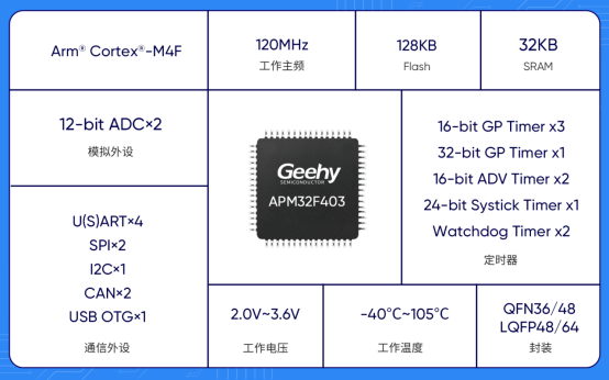 APM32F403系列新品已正式投入量产供货并开发派样,索样可联系极海各办事处销售经理。