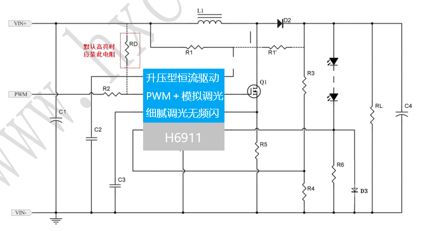 PWM调光:H6911支持PWM调光,且调光频率和分辨率都很高,使得用户可以根据需要灵活调整LED的亮度。