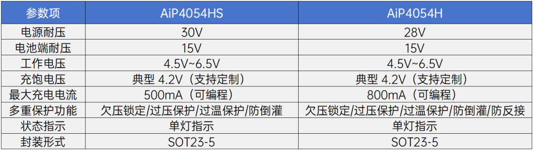 AiP4054HS不仅延续了AiP4054小体积SOT23-5封装、500mA可编程充电电流的优势,更将电源耐压提升至30V,电池端耐压15V,同时支持20V电源热插拔,并新增输入过压保护,可兼容多种高压适配器!