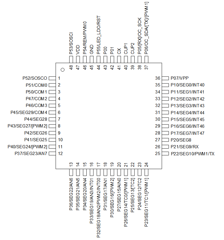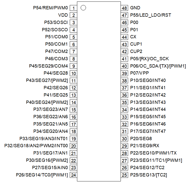 - LCD:4COM*30SEG或5COM*29SEG,支持内建电压稳定型,升压电路只需外接2个电容