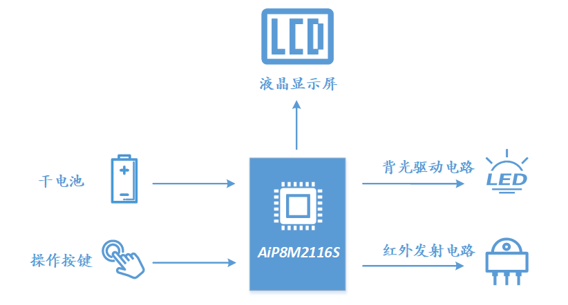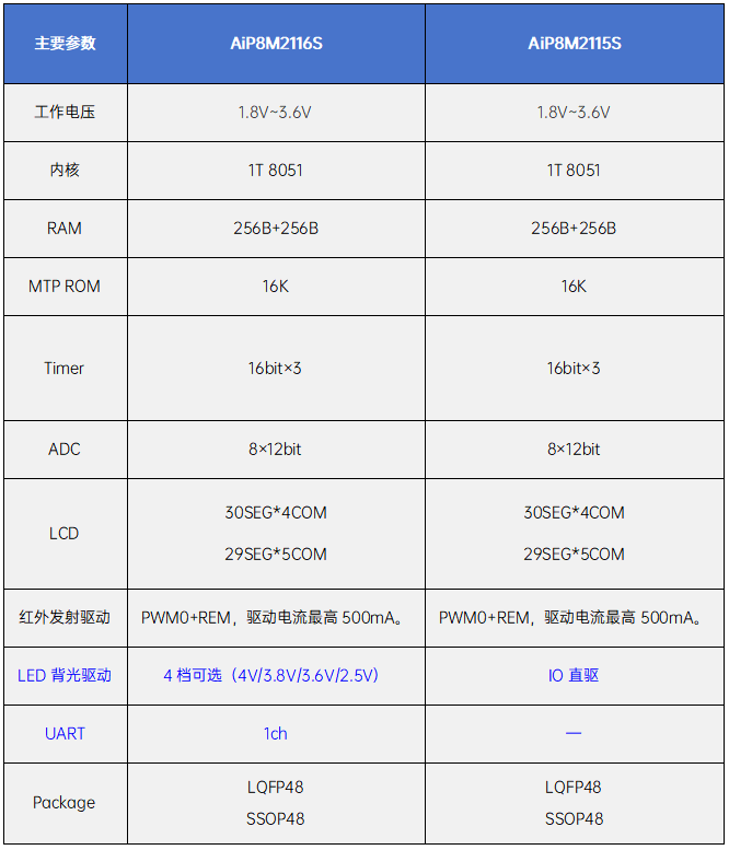 AiP8M2116S/AiP8M2115S是低功耗8051内核MCU,内置16KB MTP ROM、256B XRAM、256B IRAM,内部集成Timer0/1/2、REM、UART、LCD、RTC、和12bit-ADC。AiP8M2116S是一款LCD型低功耗8051内核MCU,具有低功耗特点,可应用于空调遥控器领域。