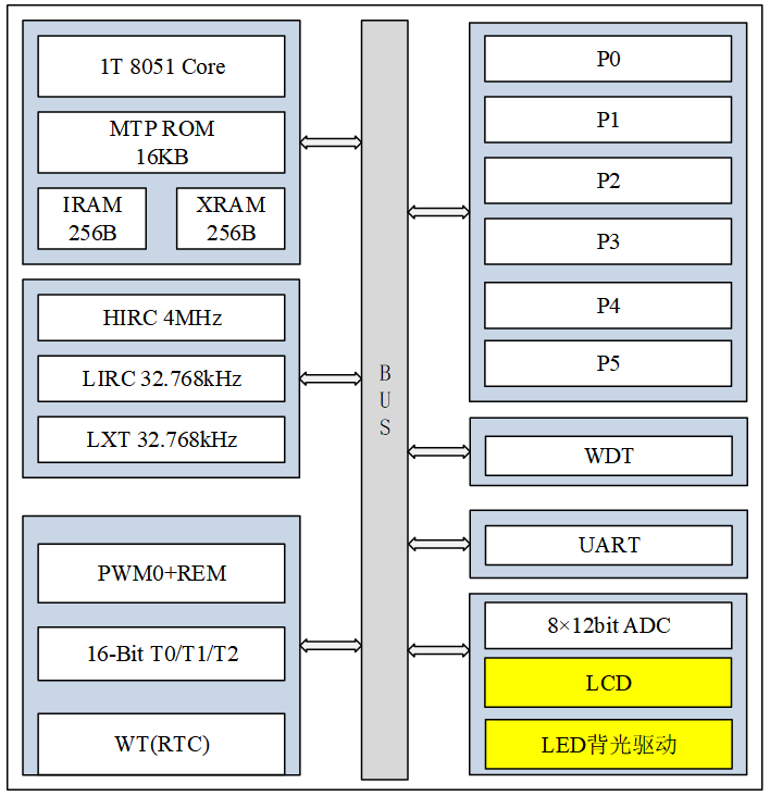 - 存储容量:256B IRAM、256B XRAM、16KB MTP,MTP擦写次数100次。