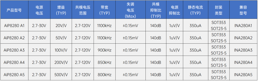 AiP8280是一款电流检测放大器,工作电压范围为2.7V至30V,可测量分流电阻两端2.7V-120V宽共模电压降;提供五档增益,超低失调电压兼具1.1MHz高带宽(20V/V增益下)。