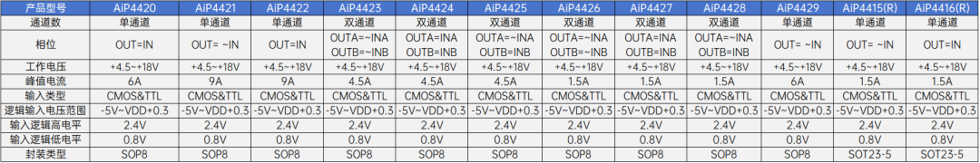 AiP4415(R)、AiP4416(R)系列是系列是高速、高性能的1.5A单路栅极驱动器,输出驱动MOSFET和IGBT等功率器件。逻辑兼容CMOS和TTL信号输入且最低电压可达-5V,主要功能为将常压输入转换为高压输出,在全电压范围内具有交直流参数稳定的特点。