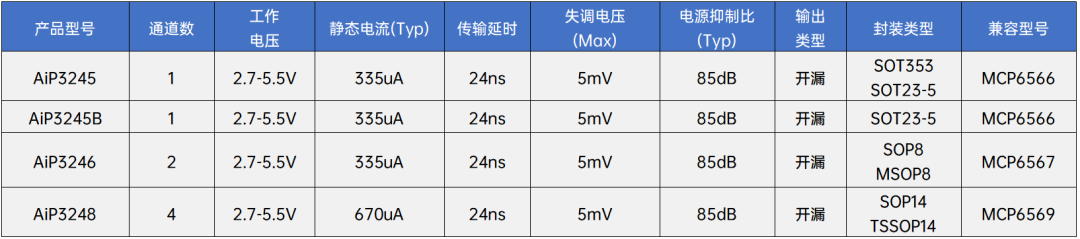 在工业自动化检测、高端测试测量、高速数据采集等前沿领域中,信号的快速且精准处理已成为系统性能突破的核心诉求。为适配这些场景的技术需求,中微爱芯推出的AiP324X系列的比较器凭借24ns的低传输延迟特性精准契合不同需要对信号快速比较的场景,其中,AiP3245、AiP3245B、AiP3246和AiP3248分别是单通道、双通道和四通道开漏输出比较器电路,具有快速响应、低功耗、轨到轨输入、低偏移电压和高输出驱动电流等特性。