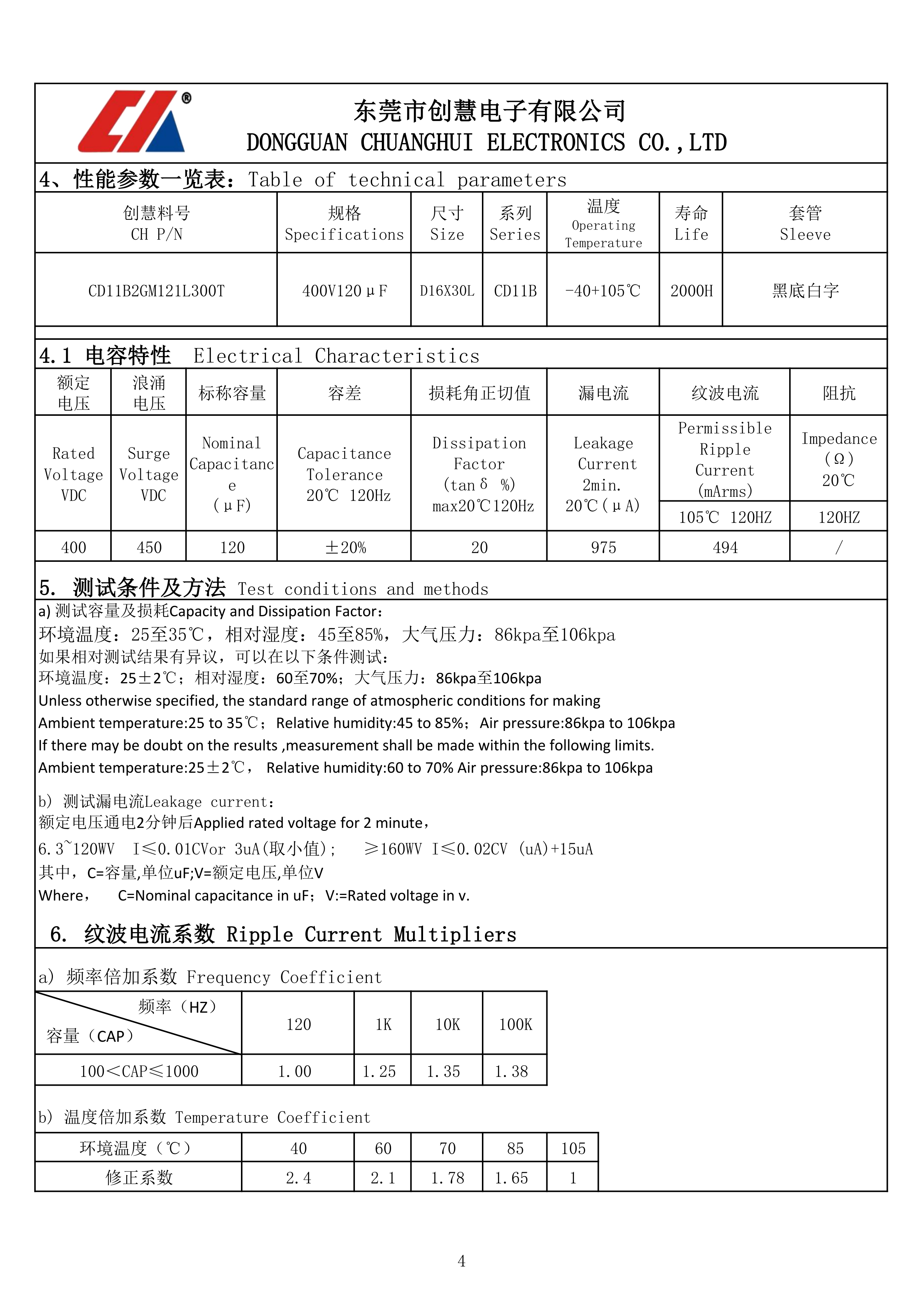 铝电解电容CD11B系列120uF 400V ±20%插件,D16xL30mm