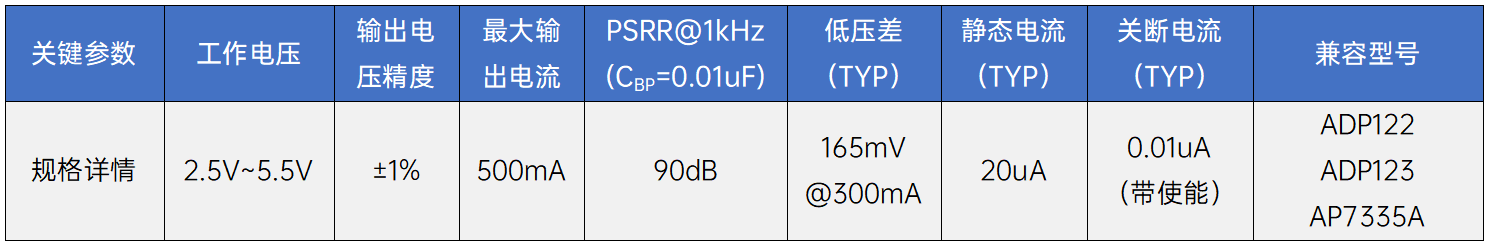 - 固定输出电压:0.8V、0.9V、1.0V、1.05V、1.1V、1.2V、1.3V、1.35V、1.5V、1.8V、1.85V、2.1V、2.2V、2.3V、2.5V、2.6V、2.7V、2.8V、2.85V、2.9V、3.0V、3.1V、3.3V、3.6V、4.2V、4.4V和5.0V