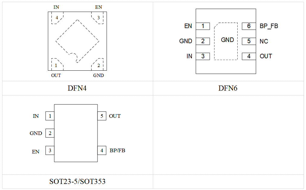 - 封装:有使能:SOT23-5、DFN4、DFN6和SOT353