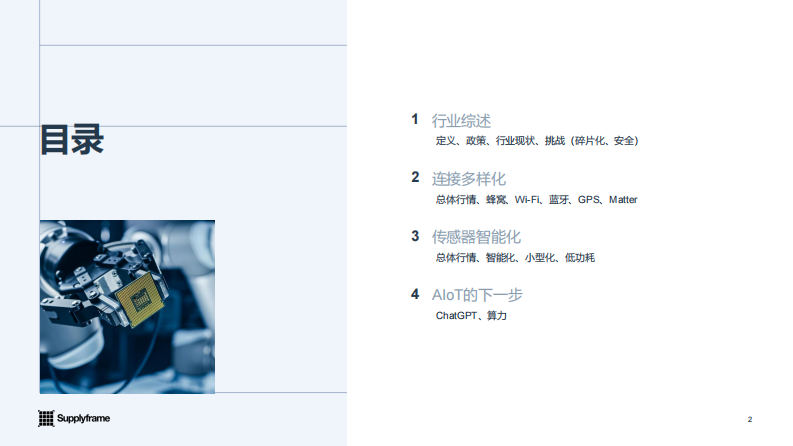 在本次报告中,我们围绕四个方向展开,分别是行业综述、连接多样化、传感智能化,以及简单讨论AIoT发展的下一步。