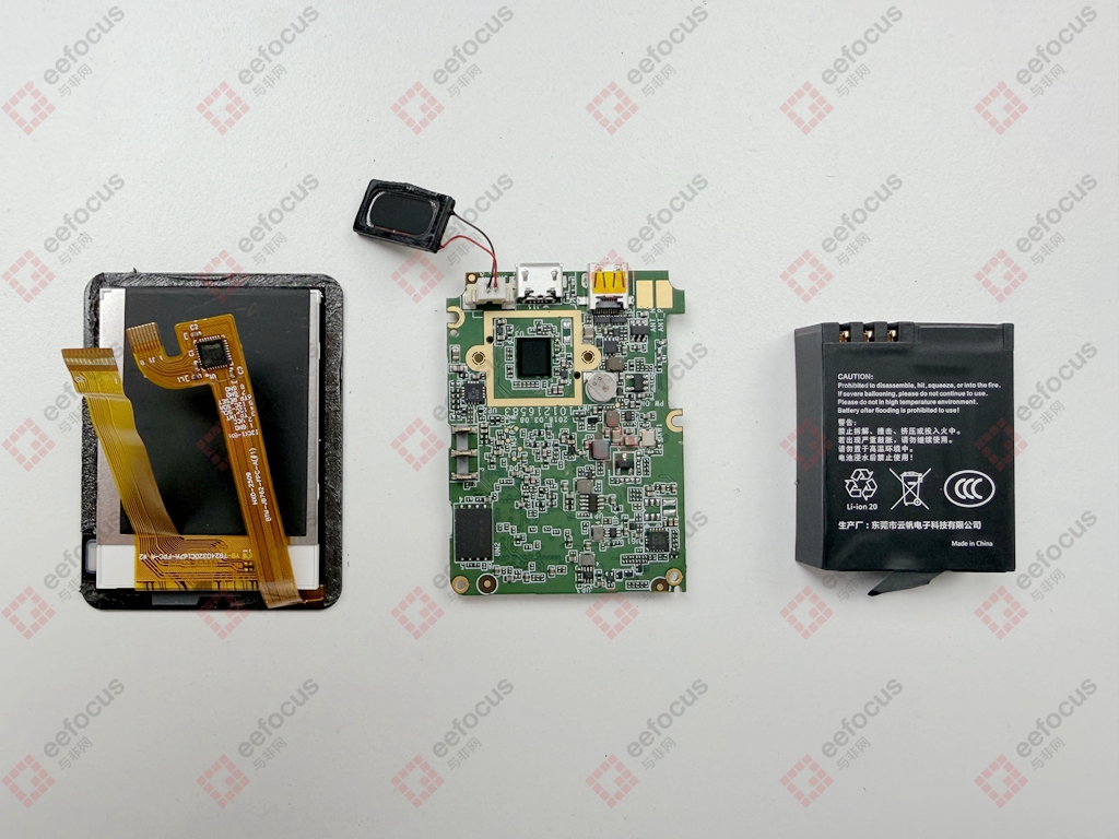 拆解完来看一下,除了一堆结构件,其它主要的组件包括了一块带有触摸屏的屏幕、一块可拆卸的电池以及运动相机核心的PCB主板。