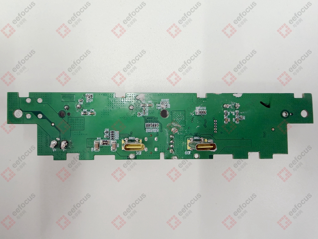 滑环PCB信号线的另一头C口直接连接到PCB主板的Type-C母接口上。在PCB上标注的丝印可以看到分别是30W和60W的输出功率,然后主板这一面就是一些被动的阻容器件,并且包含了连接点烟器头的12V电源焊盘接口。重点来看下PCB主板的另一面,基本上所有的元器件都布局在这一面。