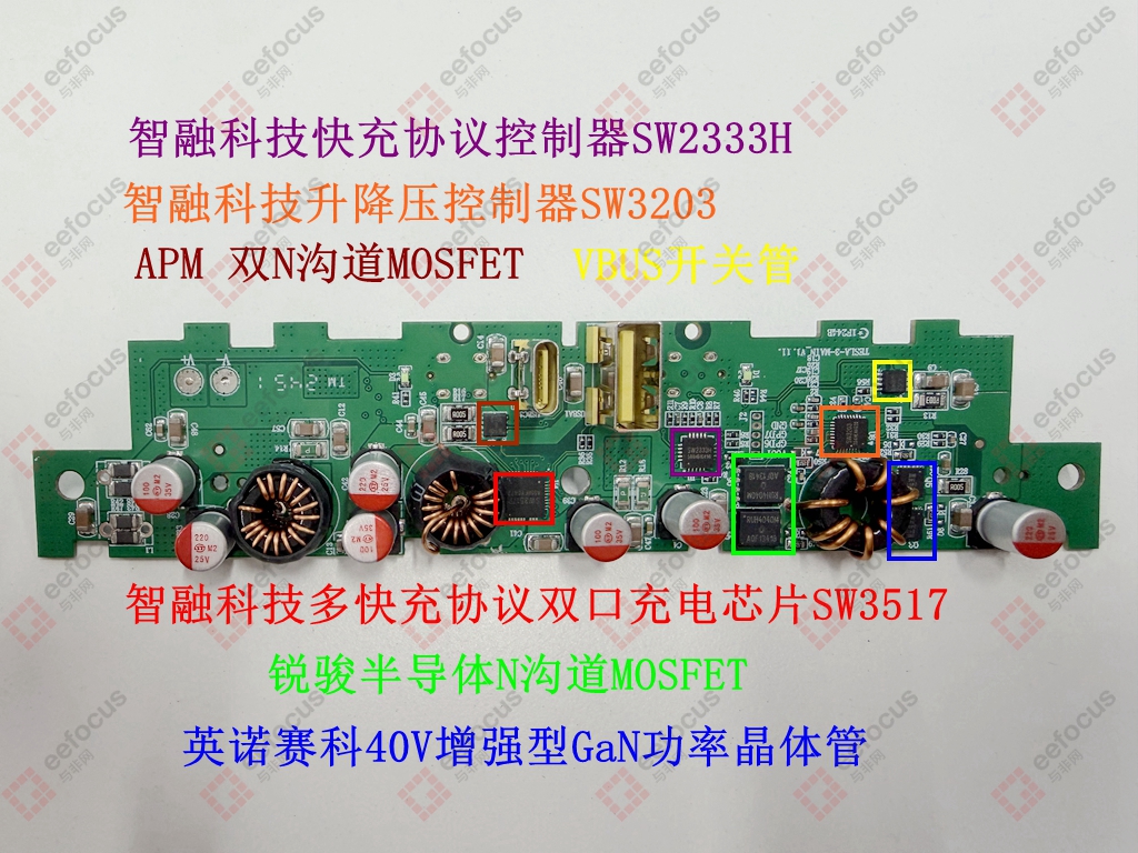 PCB板中间为智融科技的多快充协议双口充电芯片SW3517,可实现Type-C与Type-A双接口任意单口快速充电功能,并支持双口独立限流管理,并且芯片内部集成了5A高效率同步降压变换器,配合少量外围元件,即可构建一套高性能、多协议兼容的双口快充系统,具有高集成度与高性价比的显著优势。比如这个产品上,就和旁边的APM双N沟道MOSFET(AP10H03DF)配合实现充电方案。