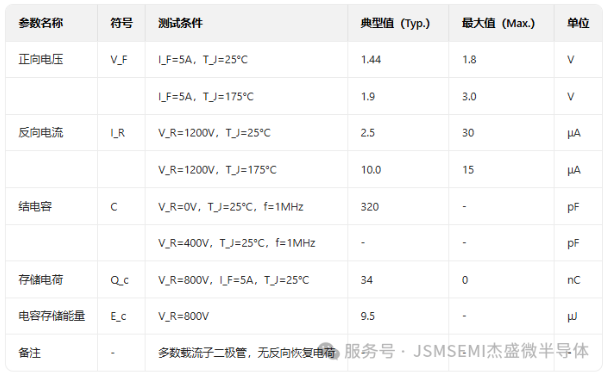 在正向导通性能方面,当正向电流 IF=5A、结温 TJ=25℃时,SC4D02120E-JSM 的正向电压 VF 典型值仅为 1.44V,最大值不超过 1.8V;即使在 175℃的高温工况下,正向电压最大值也控制在 3.0V 以内,与 C4D02120E 的导通损耗水平相当,有效降低了器件工作时的能量损耗。