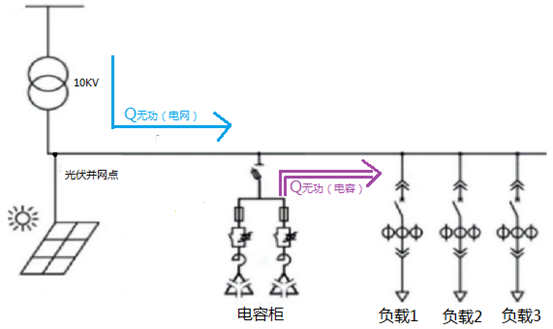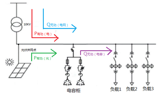 光伏并网会导致电路功率因数下降,需更多电容进行无功补偿,同时需关注光伏并网点位置及无功补偿控制器是否支持四象限控制。