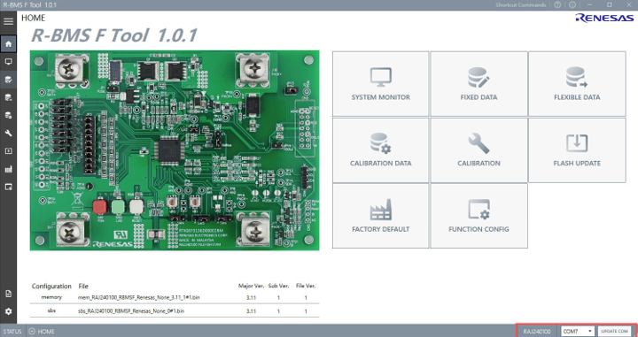 按下板卡上的”PON”开关启动系统,当系统正常启动后,LED1会转变为绿色(请确保JP2短接)。此时,打开R-BMS F软件,系统会自动地连接板卡,并在右下角显示连接的端口。