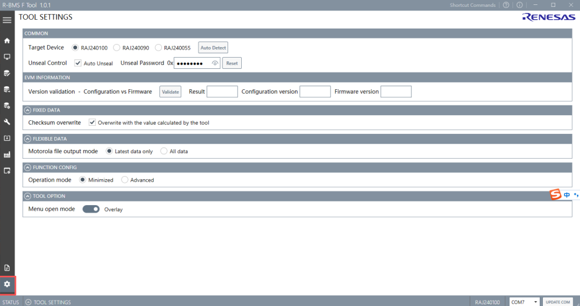 在开始使用R-BMS F软件对板卡进行测试之前,首先需要我们进行一些设置,点击软件界面左下角的设置图标,打开设置界面,我们可以看到有很多功能选项,如可以让软件自动识别目标设备、对开发板的版本进行验证等等,工程师们可以根据自己的需求进行设置。